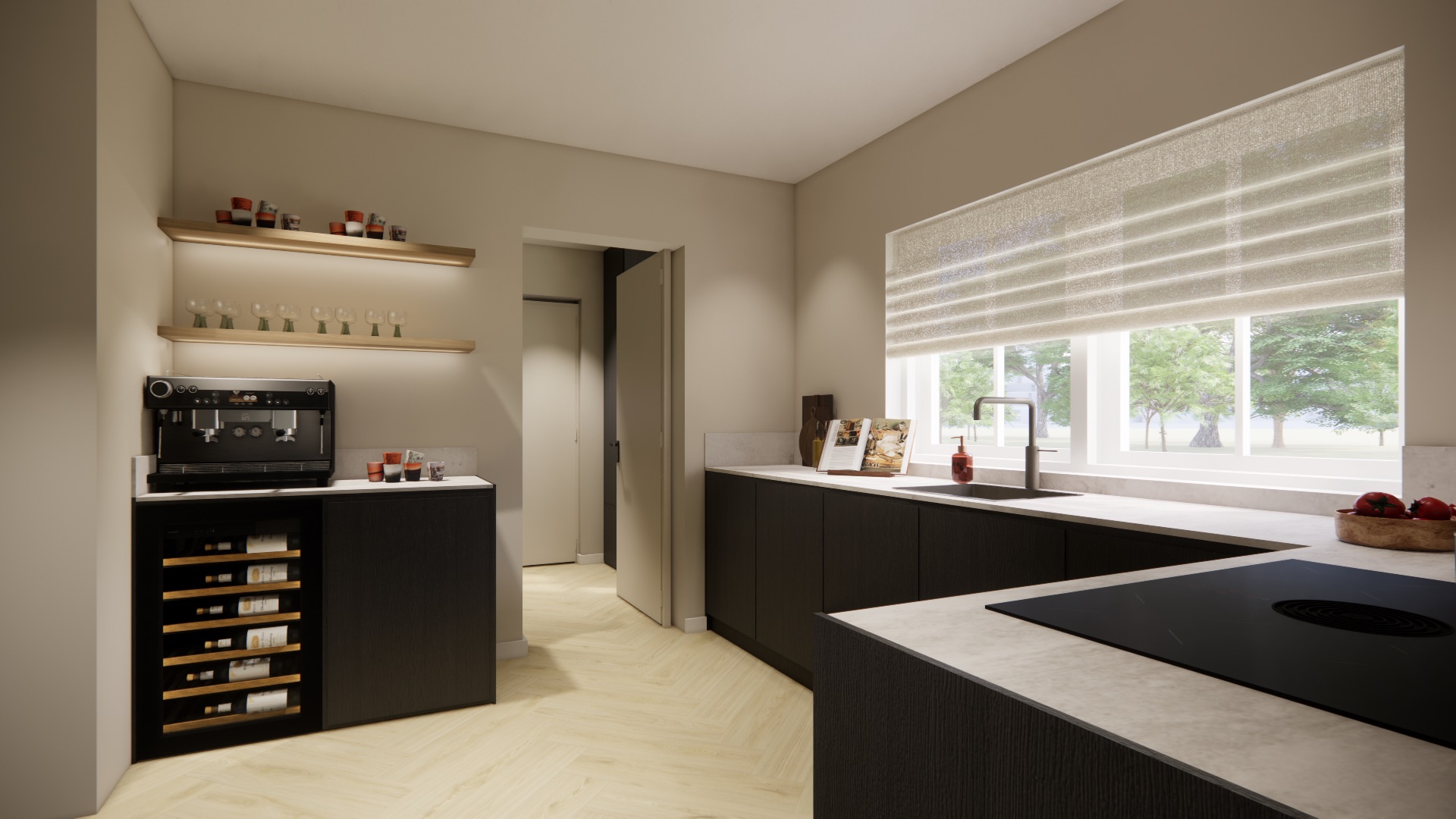Voor de bijkeuken ontwierp ik een maatwerk kast waarin de wasmachine en droger netjes zijn weggewerkt, geheel in de stijl van de keuken. In de keuken zelf ontwierp ik een stijlvolle koffie- en wijnbar op maat, die perfect aansluit bij de rest van het interieur. De hal kreeg een toffe binnenkomer, met een op maat gemaakte garderobekast en een spiegel met LED-verlichting voor een moderne touch.