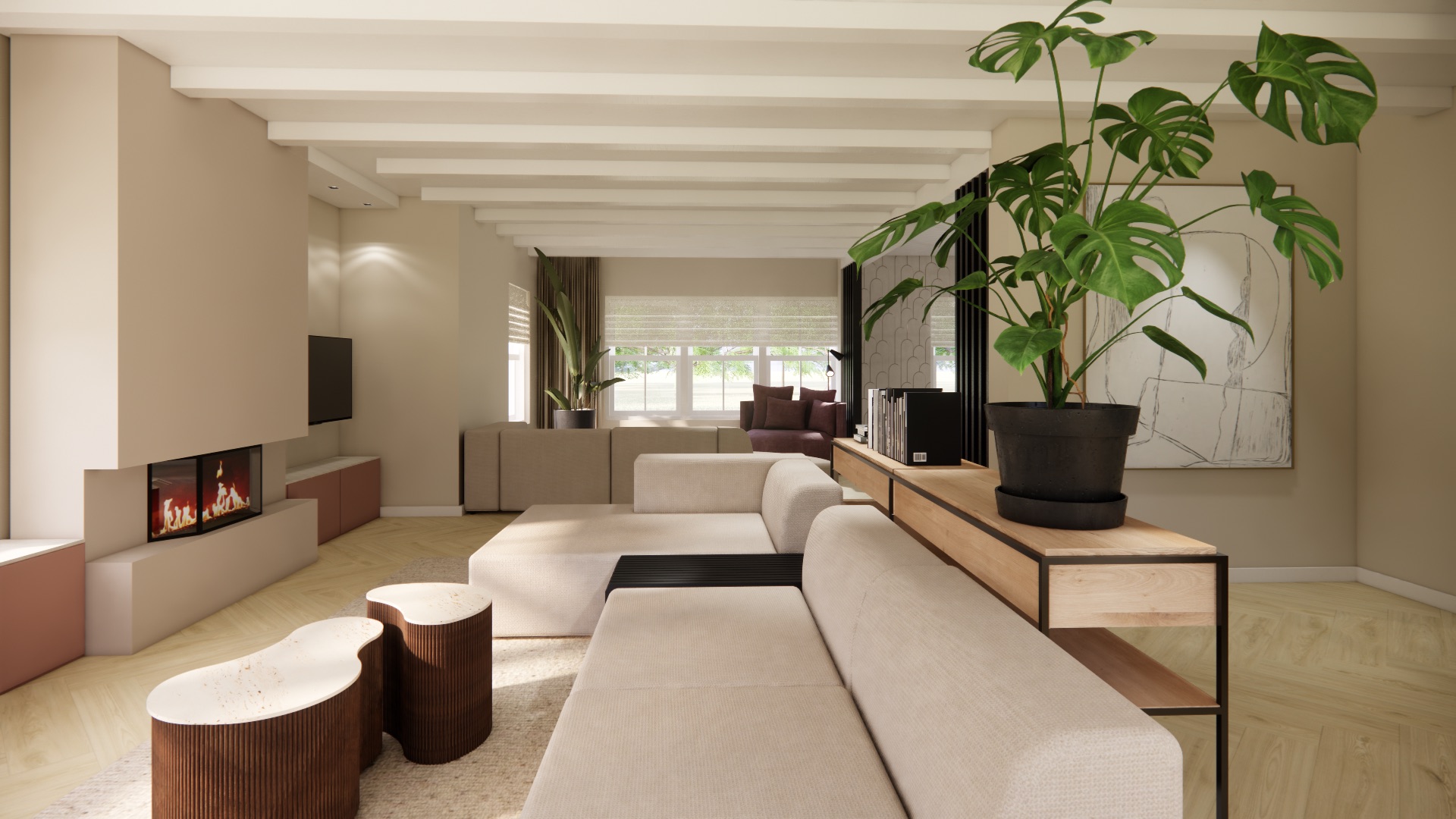 De wensen van het stel waren duidelijk: een praktische indeling met genoeg ruimte voor de kinderen, maar ook gezellige hoekjes om te ontspannen. Ik ontwierp een indelingsontwerp in 3D, ondersteund door een animatie in kleur. Om een extra speelhoek voor de kinderen te creëren, stelde ik een modulaire bank voor. Zo blijft de ruimte open en flexibel, maar ontstaan er toch meerdere knusse zithoeken.