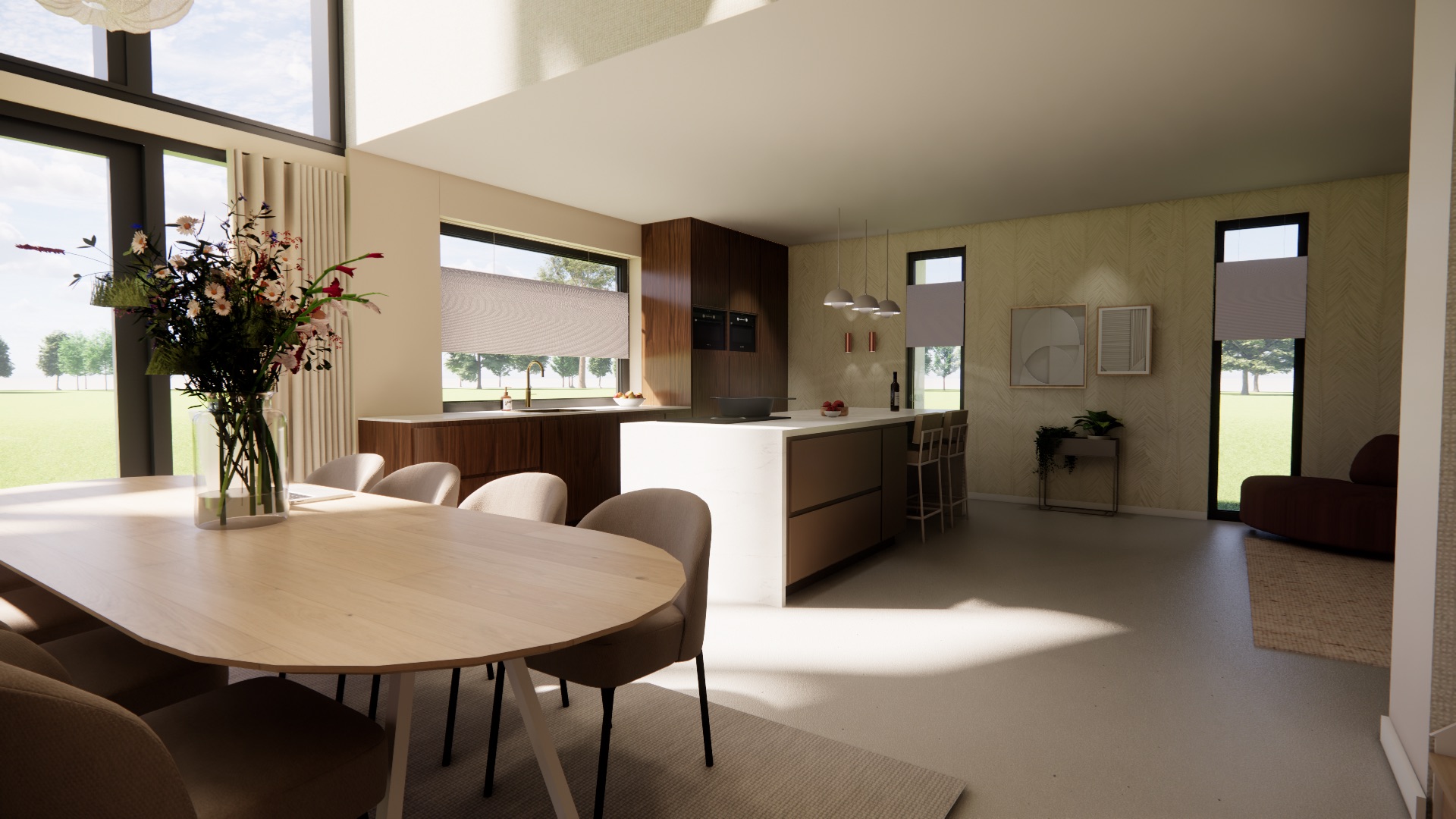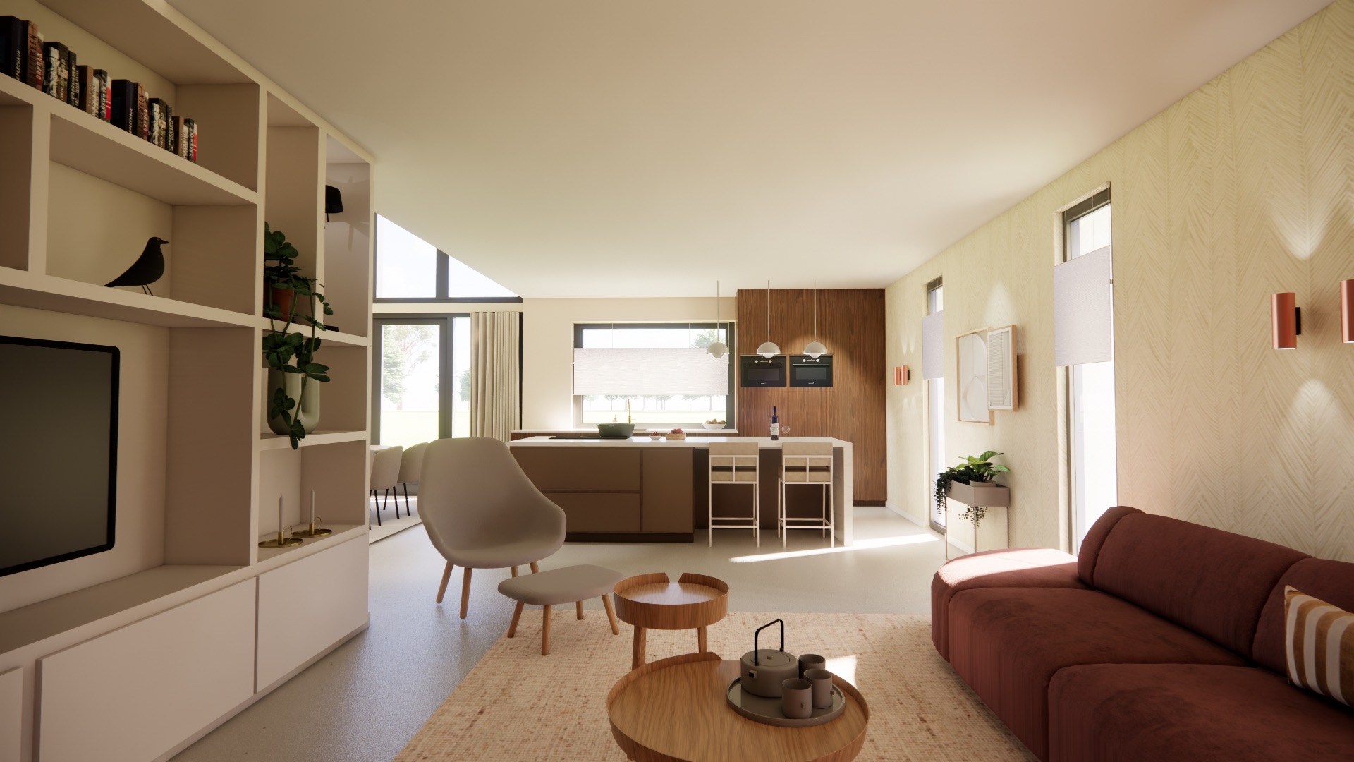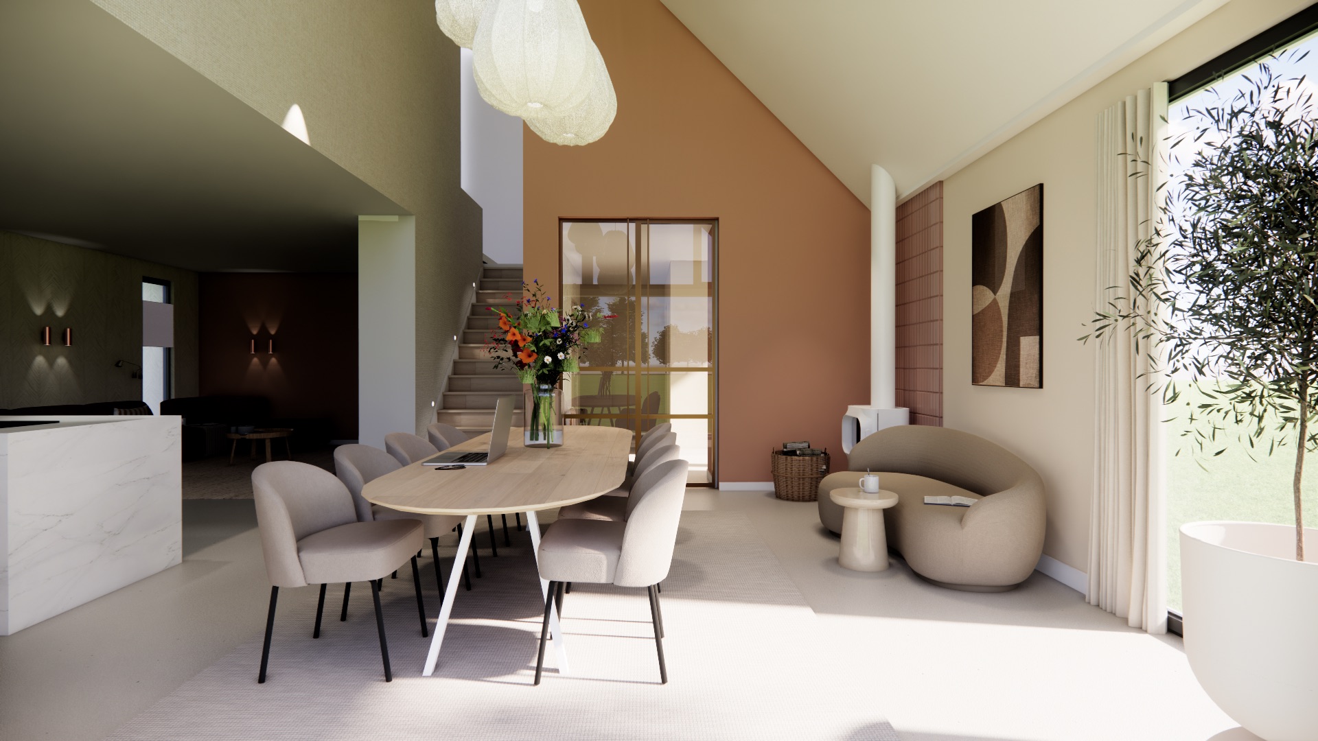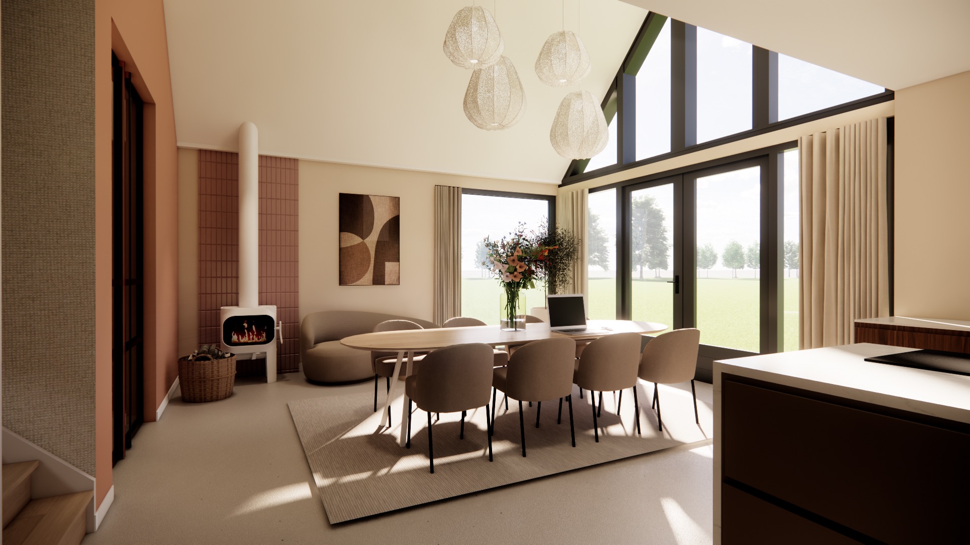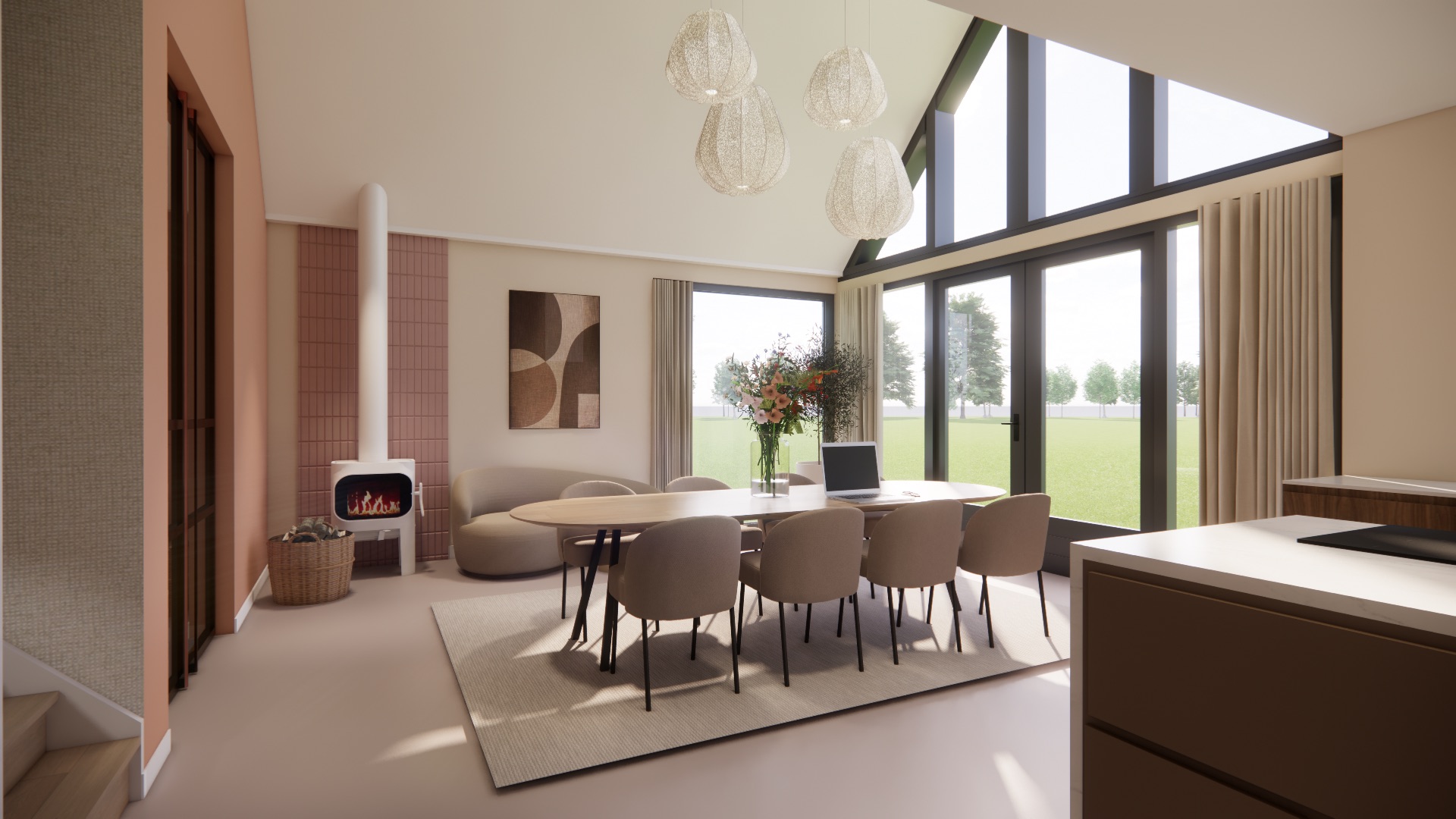 Voor dit stel heb ik diverse 3D ontwerpen gemaakt om visueel te kijken naar de beste indeling voor hun nieuwe woning. De inspiratie voor hun interieur hebben we opgedaan door hun favoriete stijlen en wensen in kaart te brengen. De keuken vormt het hart van het huis, met een prachtige pui die een prachtig uitzicht biedt op de groene omgeving. Een heerlijke leefkeuken was een feit. De houtkachel in de woonkamer heeft extra voor de warmte en sfeer gezorgd. Deze stijl heb ik doorgetrokken naar de woonkamer en speelkamer, waarbij ik aandacht heb besteed aan zichtlijnen en hoogtes om een samenhangend geheel te creëren zonder dat het één ruimte wordt.